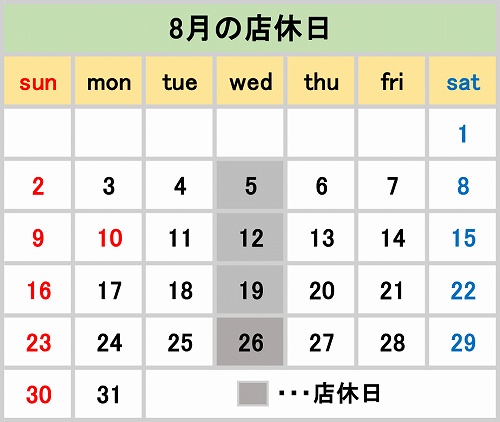 特にお盆休みは設けず、毎週水曜日をお休みさせていただきます。