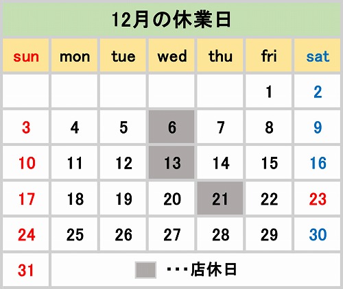 12月の店休日をご案内します。