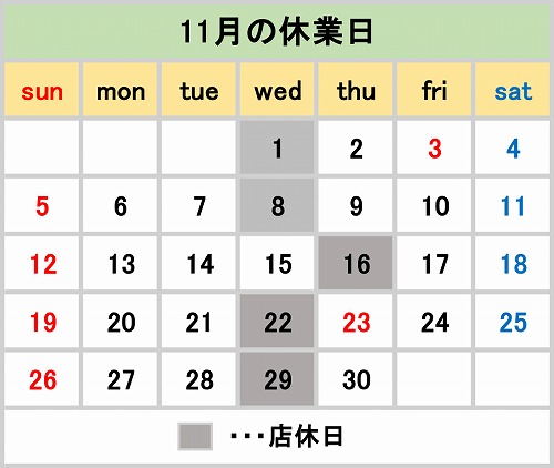 11月の店休日をご案内します。