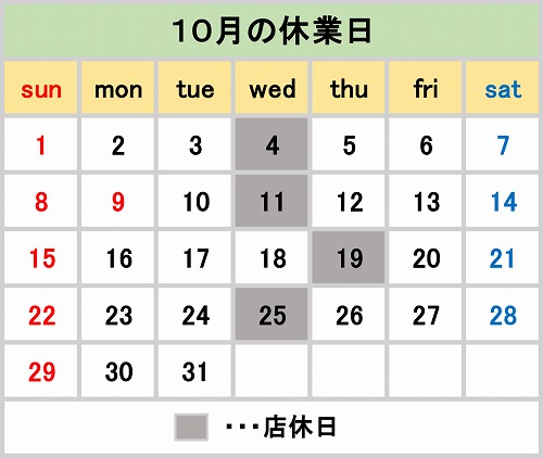 今月は18日の第3水曜日が営業日ですので、翌19日木曜日がお休みとなります。