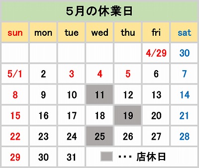 ゴールデンウィークならびに5月の店休日をご案内します。
