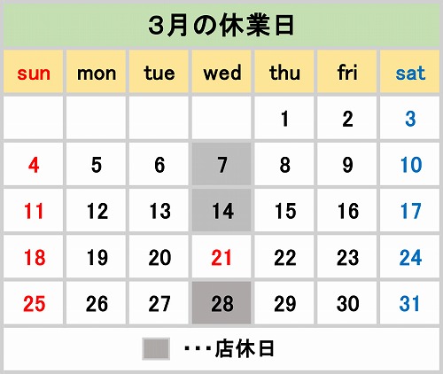 そんなこんなで3月の店休日ですが、21日の水曜日が春分の日で祝日ですので、