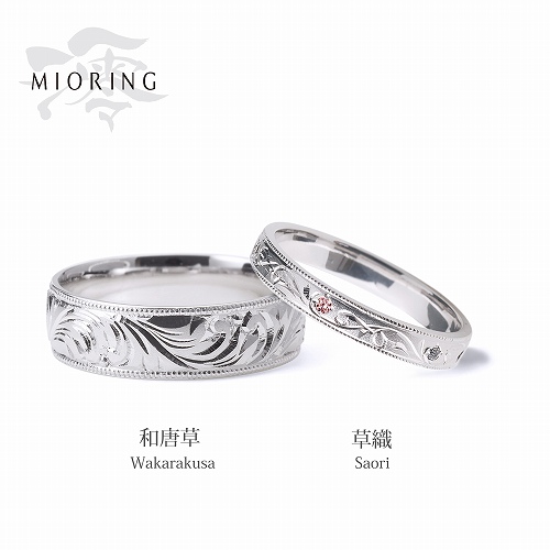 上の写真が実際にふたりが着用しているMIORINGの「和唐草」と「草織」。